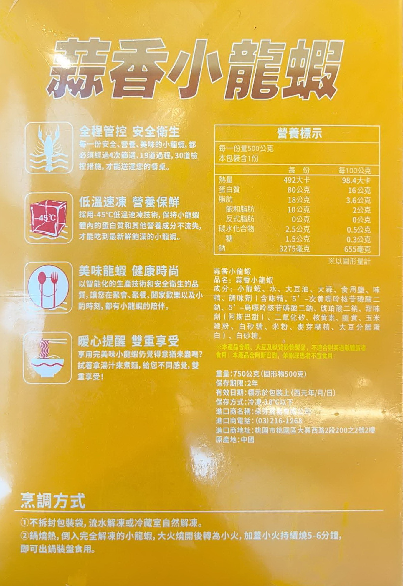 重量:750g / 盒 產地:中國 保存方式:冷凍-18度c以下 調理方式:本產品非供即食,解凍後即可食用 注意事項:本產品含有蝦、大豆、蠶豆及麩質穀物製品,不適合其過敏體質者食用