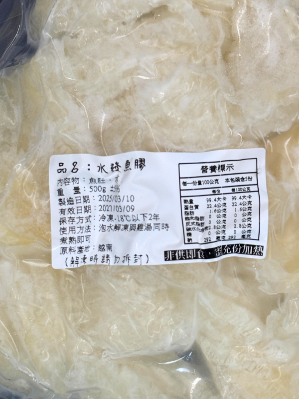 膠質豐富,口感厚實滑順,適合跟雞湯一起燉煮。