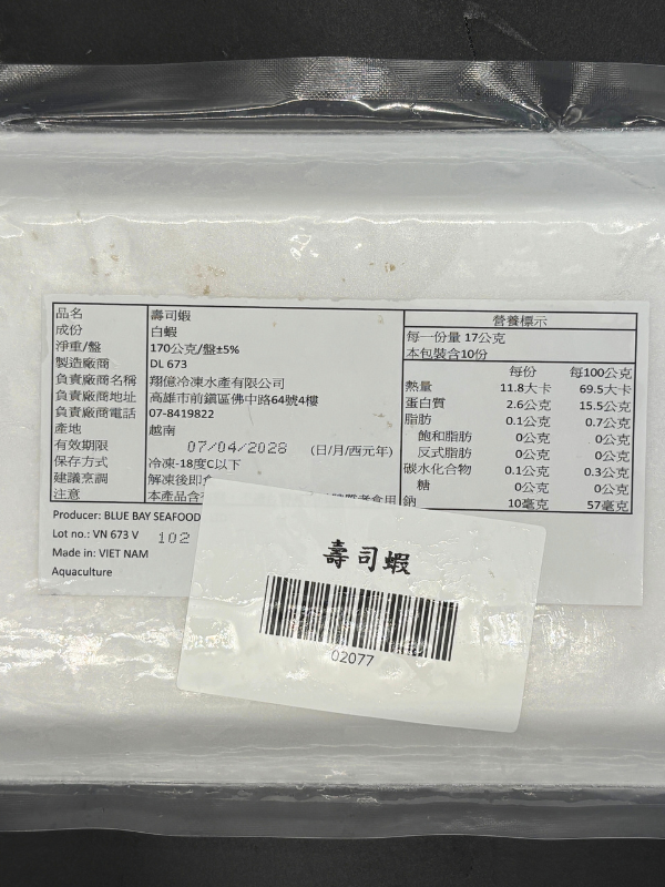 嚴選新鮮白蝦製作,經急速冷凍鎖住鮮甜原味。