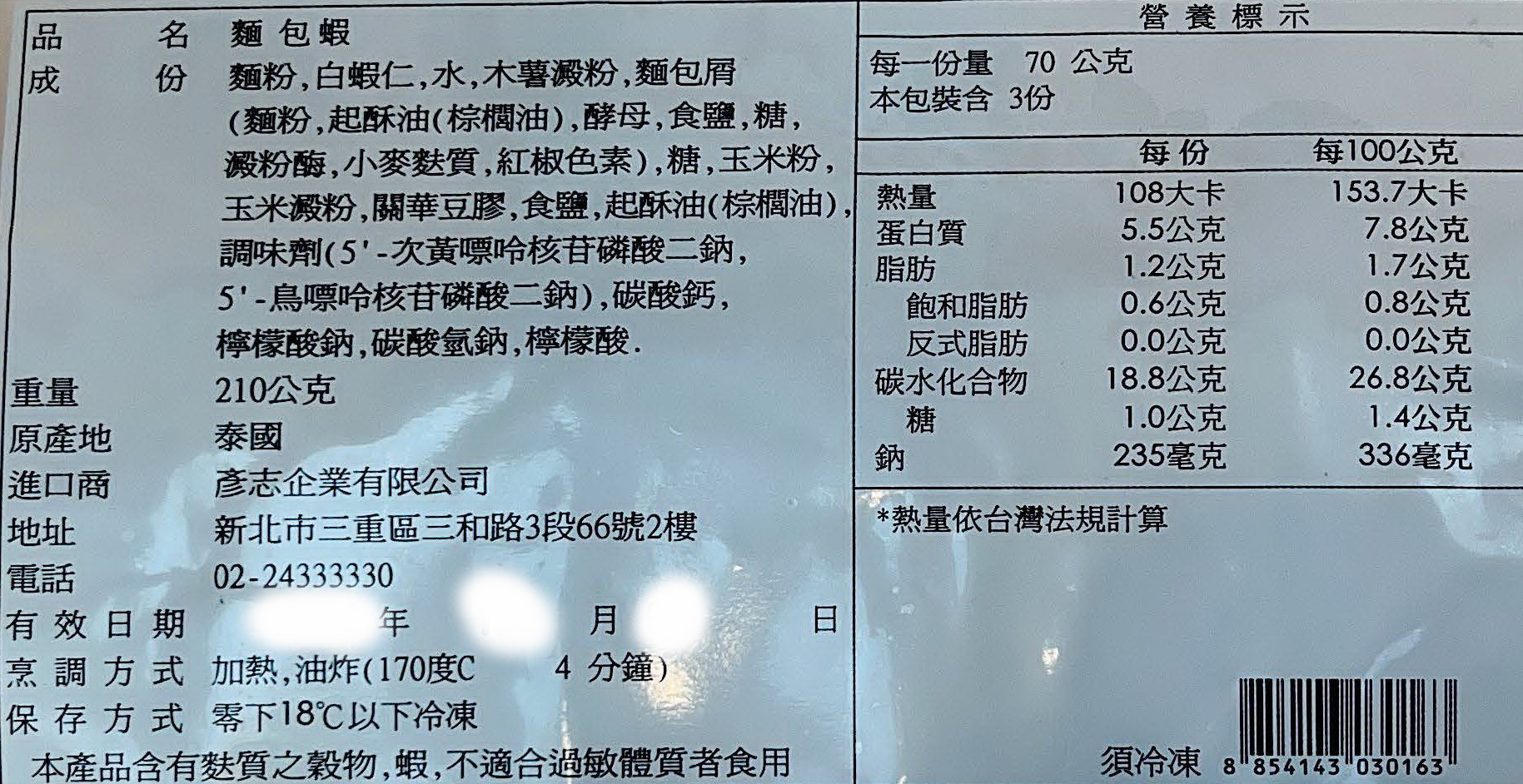 內容物名稱(成分):蝦仁、麵包屑、棕梠油、小麥澱粉…等