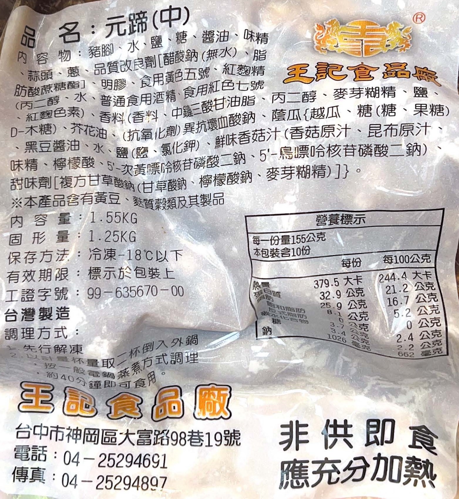 內容物名稱(成分):豬前腳、糖、醬油、蒜頭、蔥、蔭瓜…等