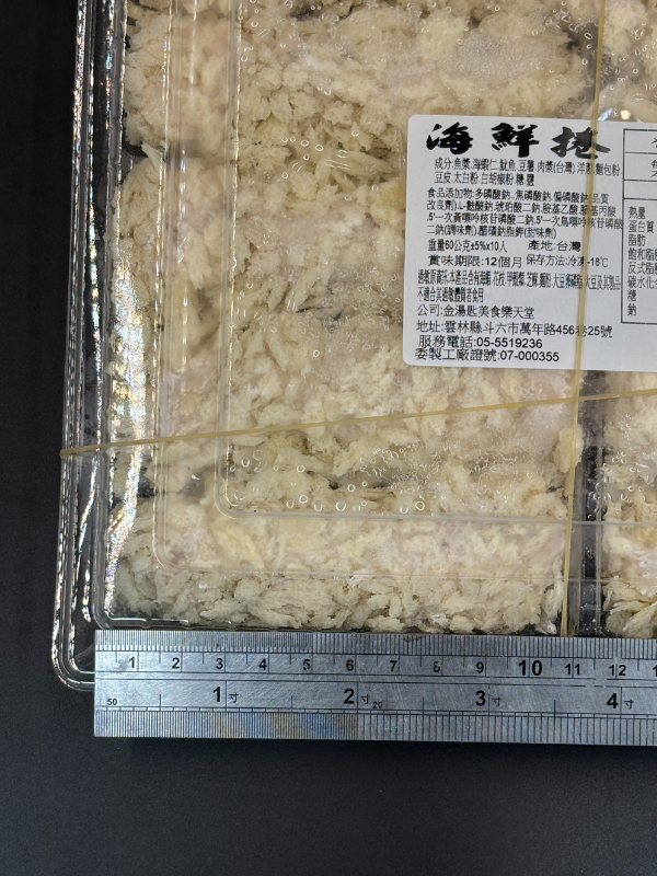 新鮮魚漿、蝦仁及魷魚,外層再裏上酥脆外皮